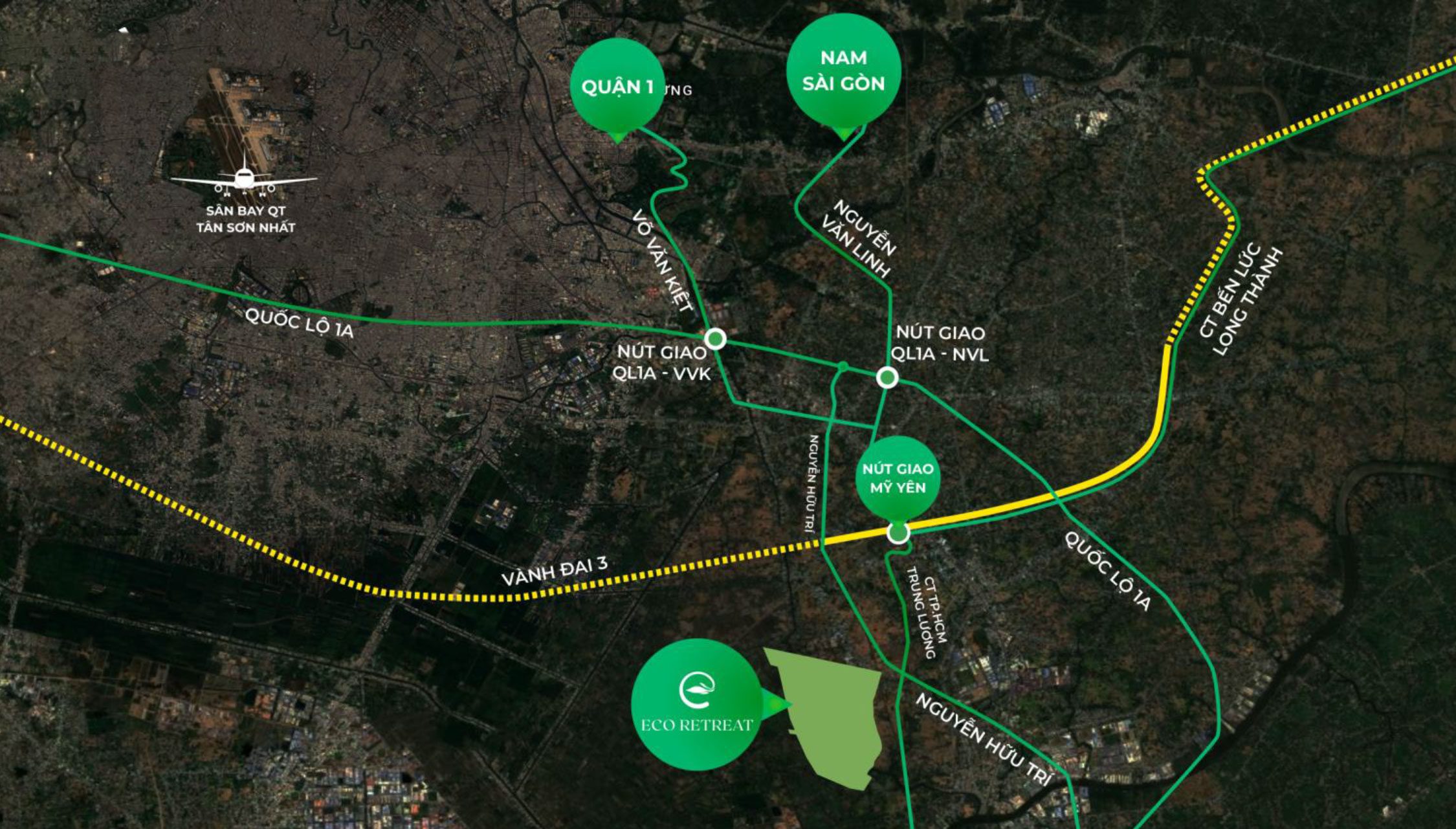 Eco Retreat kết nối thuận tiện qua cao tốc Bến Lức – Long Thành, Vành đai 3 và Quốc lộ 1 mở rộng. Tuyến Nguyễn Hữu Trí nâng cấp giúp rút ngắn thời gian di chuyển về TP.HCM.